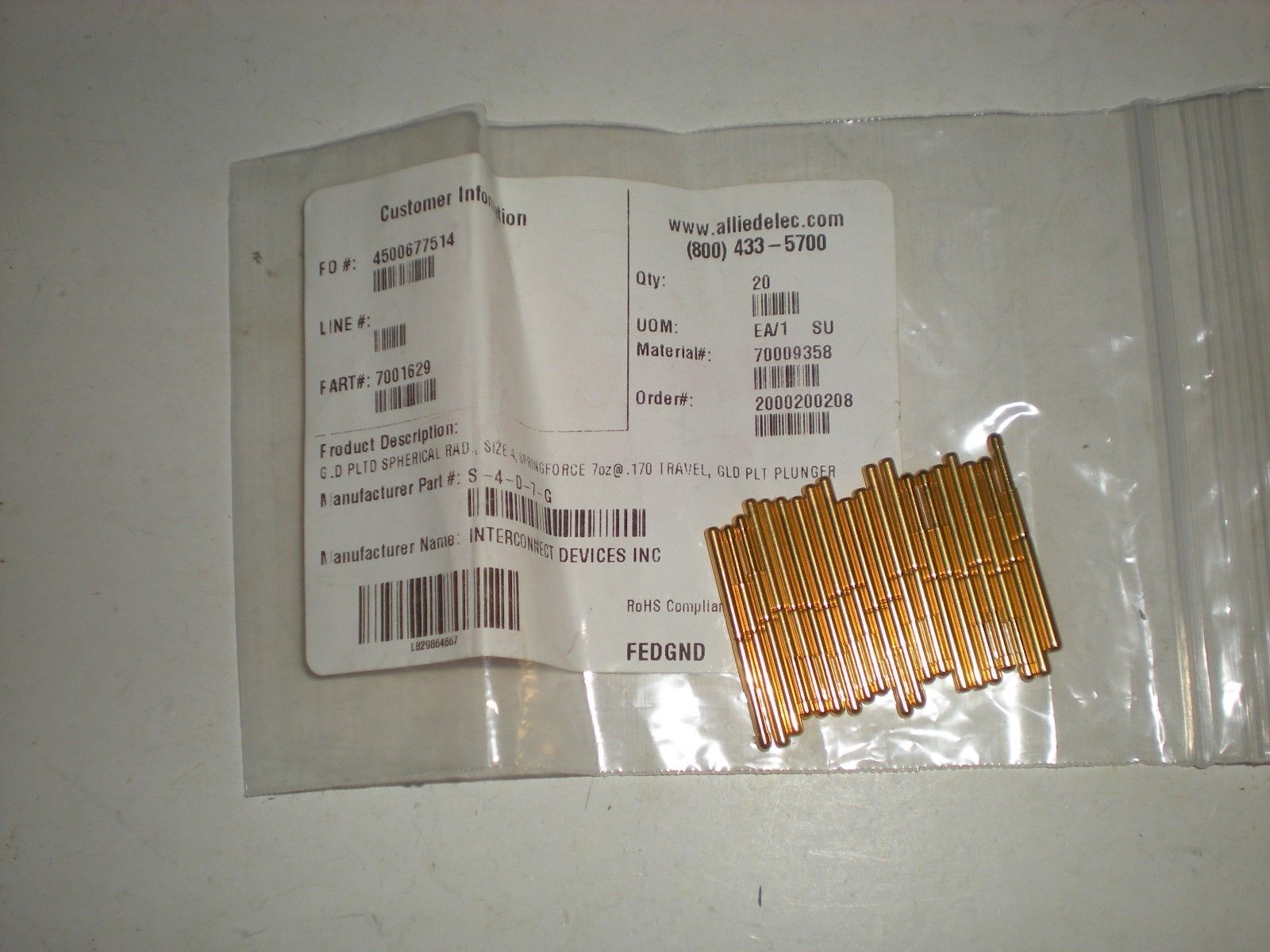 (PK OF 20) INTERCONNECT DEVICES S-4-D-7-G S4D7G SIZE 4 SPRING CONTACT PROBE NEW