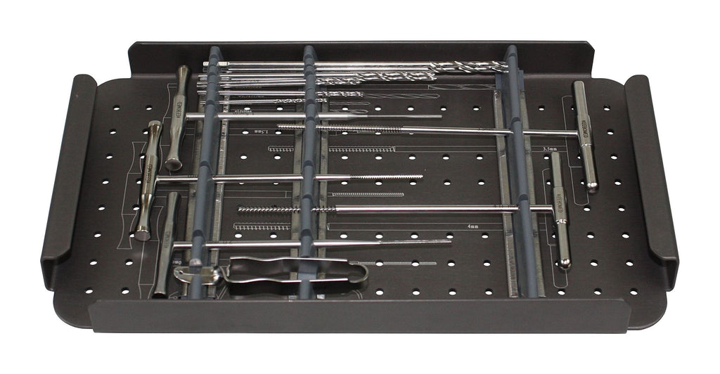 This is a complete kit of orthopedic instruments, bone screws, and bone plates for small autoclaves. Everything is constructed of high quality stainless steel. The cases are made of strong aluminum. All screws are self-tapping with a hex head. Includes 1 Aluminum Case (Approx. Dimensions: 11 3/4"L x 7"W x 4"H); 1 Screw Case 1.5/2.0/2.7/3.5/4.0mm (Approx. Dimensions: 9 1/2�L x 4 1/2�W x 2 5/8�H); 1.1mm Drill Bit (2); 1.5mm x 80mm Drill Bit (2); 2.0mm x 80mm Drill Bit (2); 2.5mm x 115mm Drill Bit (2); 3.2mm x 150mm Drill Bit (2); 1.1mm Neutral & Loaded Drill Guide; 1.5mm Neutral & Loaded Drill Guide; 2.0mm Neutral & Loaded Drill Guide; 2.5mm Neutral & Loaded Drill Guide; 3.2mm Neutral & Load Drill Guide; 1.1mm & 1.5mm Tap Sleeve; 2.5mm & 3.5mm Tap Sleeve; 3.2mm & 4.0mm Tap Sleeve; 2.0mm & 2.7mm Tap Sleeve; HA 1.5mm Tap; HA 2.0mm Tap; HA 2.7mm Tap; HA 3.5mm Tap; HA 4.0mm Tap; Small Screw Forceps; Hex Head Screw Driver SW2.5mm; Hex head Screwdriver 1.5mm; Large 70mm Depth Gauge; Small 40mm Depth Gauge; Large 6.0mm Counter Sink; Small 4.5mm Counter Sink; Small Plate benders (pair); Large Plate benders (pair); Bone plate 1.5mm (5); Bone plate 2.0mm (6); Bone plate 2.7mm (7); Bone plate 3.5/4.0mm (10); Cortical screws self-tapping hex head 1.5mm (40); Cortical screws self-tapping hex head 2.0mm (50); Cortical screws self-tapping hex head 2.7mm (50); Cortical screws self-tapping hex head 3.5mm (48); Cancellous screws self-tapping hex head 4.0mm (27). For Veterinary Use Only in the USA.