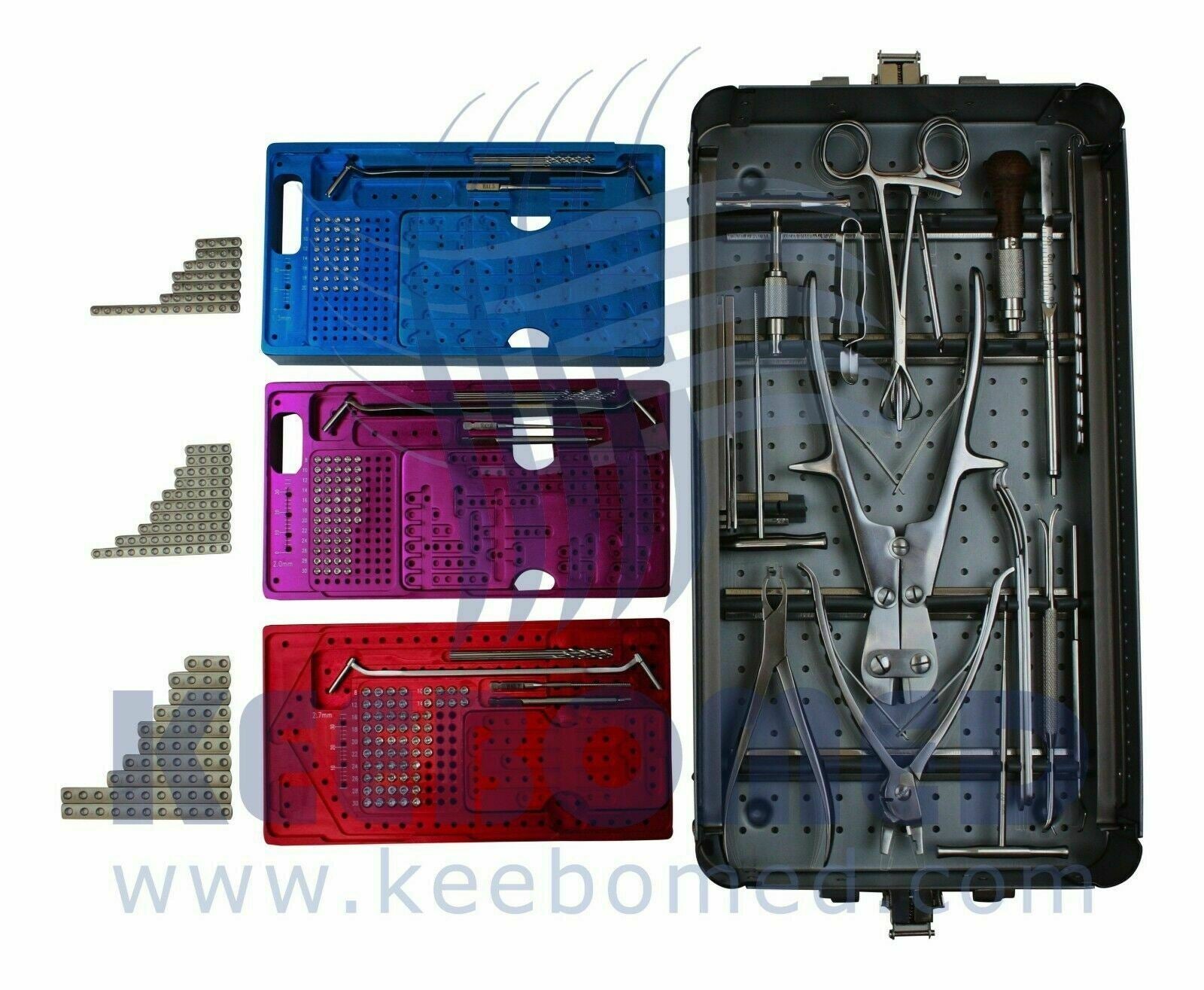 KeeboVet Micro Upgraded System has sizes 1.5mm, 2.0mm, and 2.7mm instruments and implants. This is a complete system that features stainless steel plates, self-tapping screws, and instruments.
