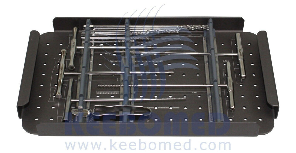 Veterinary Orthopedic Complete Kit 1.5/2.0/ 2.7/3.5/4.0mm For Small Autoclaves This is a complete kit of orthopedic instruments, bone screws, and bone plates for small autoclaves. Everything is constructed of high quality stainless steel. The cases are made of strong aluminum. All screws are self-tapping with a hex head. Includes: ---1 Aluminum Case (Approx. Dimensions: 11 3/4"L x 7"W x 4"H) ---1 Screw Case 1.5/2.0/2.7/3.5/4.0mm (Approx. Dimensions: 9 1/2” L x 4 1/2” W x 2Ā 5/8” H) ---1.1mm Drill Bit (2) ---1.5 x 80mm Drill Bit (2) ---2.0 x 80mm Drill Bit (2) ---2.5 x 115mm Drill Bit (2) ---3.2 x 150mm Drill Bit (2) ---1.1mm Neutral & Loaded Drill Guide ---1.5mm Neutral & Loaded Drill Guide ---2.0mm Neutral & Loaded Drill Guide ---2.5mm Neutral & Loaded Drill Guide ---3.2mm Neutral & Load Drill Guide ---1.1mm & 1.5mm Tap Sleeve ---2.5mm & 3.5mm Tap Sleeve ---3.2mm & 4.0mm Tap Sleeve ---2.0mm & 2.7mm Tap Sleeve ---HA 1.5mm Tap ---HA 2.0mm Tap ---HA 2.7mm Tap ---HA 3.5mm Tap ---HA 4.0mm Tap ---Small Screw Forceps ---Hex Head Screw Driver SW2.5mm ---Hex head Screwdriver 1.5mm ---Large 70mm Depth Gauge ---Small 40mm Depth Gauge ---Large 6.0mm Counter Sink ---Small 4.5mm Counter Sink ---Small Plate benders (pair) ---Large Plate benders (pair) ---Bone plate 1.5mm (5) ---Bone plate 2.0mm (6) ---Bone plate 2.7mm (7) ---Bone plate 3.5/4.0mm (10) ---Cortical screws self-tapping hex head 1.5mm (40) ---Cortical screws self-tapping hex head 2.0mm (50) ---Cortical screws self-tapping hex head 2.7mm (50) ---Cortical screws self-tapping hex head 3.5mm (48) ---Cancellous screws self-tapping hex head 4.0mm (27) For Veterinary Use Only in the USA. Helpful Customer Reviews Excellent service and product "I was very impressed with the Complete Orthopedic system. We have used it several times since receiving it and I am totally satisfied with both the product and the service." Complete Orthopedic System "Excellent ortho kit, complete set and quality at a reasonable price." Very good "Extremely professional seller! Plating kit is complete, high quality, great deal." KeeboMed, Inc Mount Prospect, IL USA "The sale of this item may be subject to regulation by the U.S. Food and Drug Administration and state and local regulatory agencies. Authorized purchasers only. If the item is subject to FDA regulation, I will verify your status as an authorized purchaser of this item before shipping of the item." If you have questions about legal obligations regarding sales of medical devices, you should consult with the FDA's Center for Devices and Radiological Health.